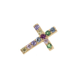 Piercing cruz oreja de 10 mm en oro, decorado con microcirconitas redondas multicolores que aportan un brillo llamativo y elegante. Un clásico atemporal perfecto para el lóbulo principal, ideal para dar un toque de color a tu look diario.