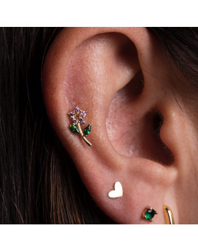 Piercing para oreja en forma de flor con tallo. Esta pieza que está compuesta por cinco circonitas rosas, un tallo de oro macizo y dos marquís verdes forma una preciosa flor silvestre que representa la primavera, el resurgir y crecimiento. Fresca y alegre, esta es una de las joyas más especiales de nuestra colección.